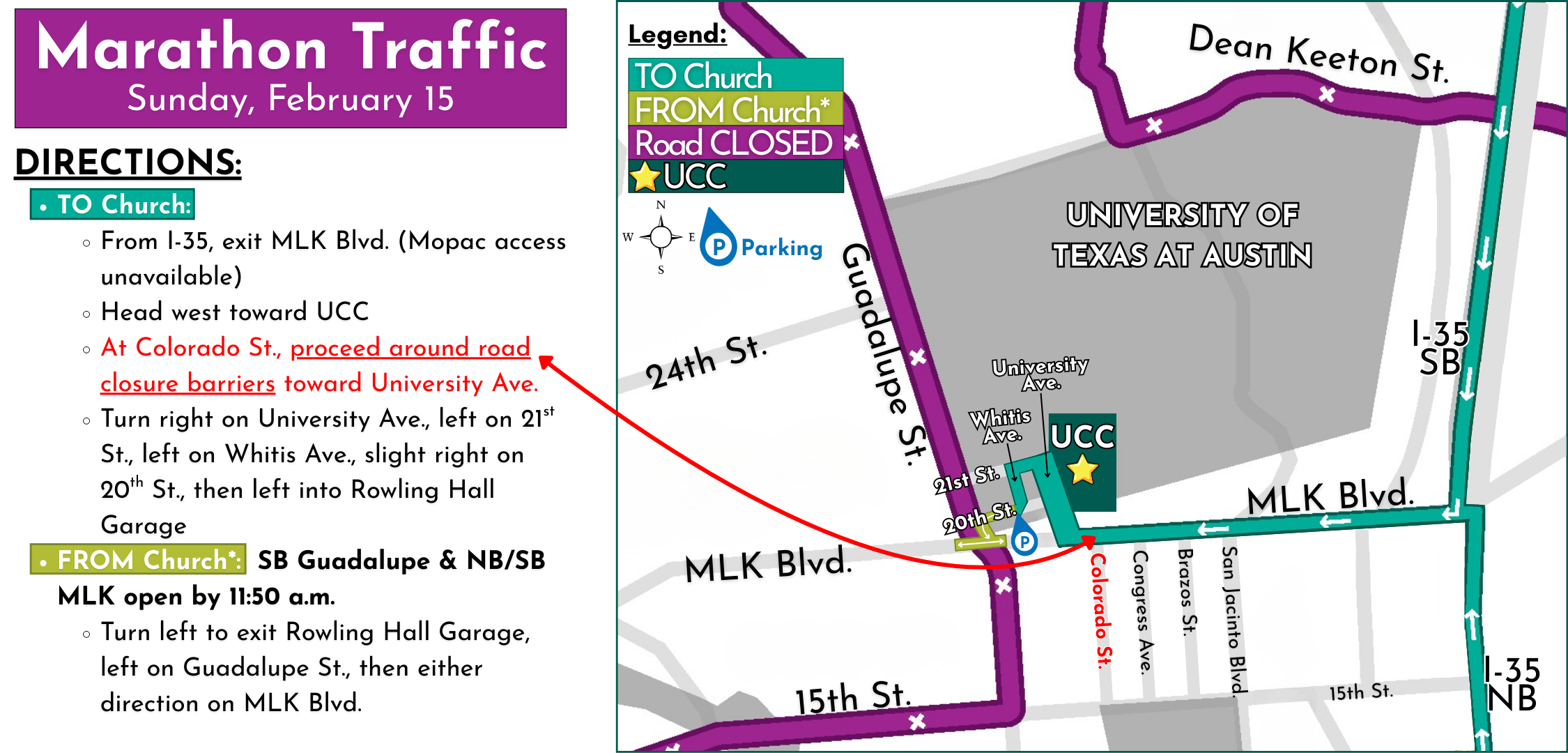 The Austin Marathon is this Sunday, February 15. Please budget extra time for your commute. Note that you will ONLY be able to access UCC from I-35 by traveling west on MLK and turning north onto University Avenue. You will be blocked from accessing UCC if you exit from MoPac. Roads near the church will re-open after 11 a.m. See the map above or click here to view a detailed UCC-specific traffic guide and instructions.